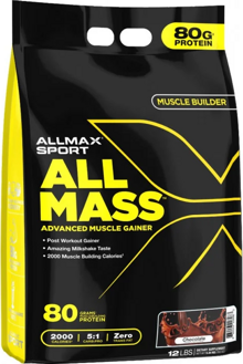 Introducing ALLMAX SPORT ALLMASS Advanced Muscle Builder. Our Advanced Muscle Builder mixes instantly in ice-cold water or milk and tastes like a thick frothy milkshake. Get a massive 2000 calories and 80 grams of protein in every 5 scoops.