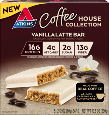 Atkins Coffee House Collection Vanilla Latte Bars blend the smoothness of real coffee with the sweetness of vanilla flavor, offering a decadent escape with 16g of protein and as much caffeine as a cup of coffee. Experience a harmony of flavors that transports you to your favorite coffee house. These soft & chewy protein bars are just right for anytime satisfaction - with the added benefit of 13g fiber. And with 4g net carbs and 2g sugar they support your nutritional goals as well as your taste buds.