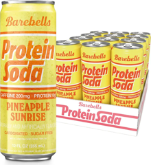 Go to StoreBarebells Protein Soda Highlights: Protein Soda is a sugar-free, sparking protein drinks that combines sweet strawberry flavor and function. Each can delivers 10g of clear whey protein isolate, 200mg of caffeine, and B vitamins, making it the ideal on-the-go protein refreshment for any time of day.