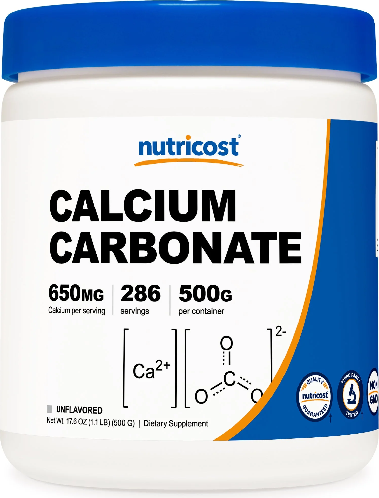 About this item Pure Calcium Carbonate Powder 500 Grams of Calcium Carbonate Per Bottle 650mg of Calcium Per Serving (Scoop Included) Non-GMO, Gluten Free, 3rd Party Tested Made in a FDA...