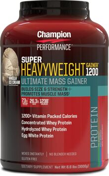 Gain competition-worthy mass in no time at all with Super Heavyweight Gainer 1200 - only from Champion Performance. With an insane 1238 weight-stacking calories per serving, it is simply impossible to rival the gain of Super Heavyweight Gainer 1200 by food intake alone. Super Heaveyweight Gainer 1200 bulks you up fast - without the bloat.0