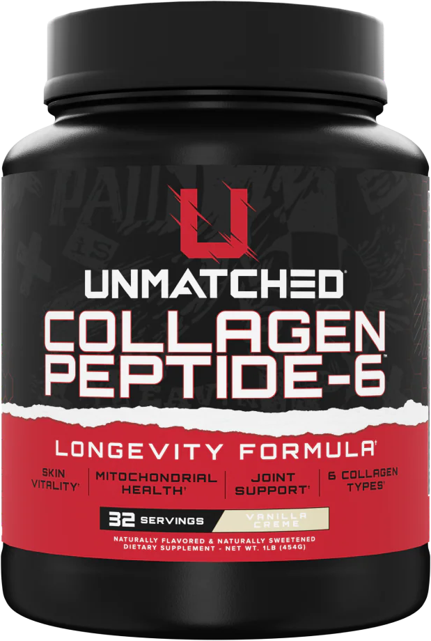 Unmatched Supps Collagen Peptide-6 provides 6 types of collagen from 3 sources plus PureWay-C and MitoPrime for joint health and tissue support. -