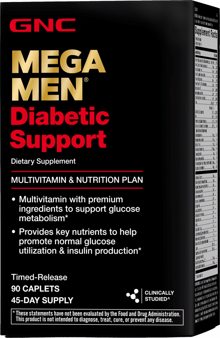 GNC Mega Men Diabetic Support: Promotes Normal Glucose Utilization & Insulin Production GNC Mega Men Diabetic Support is a multivitamin and nutrition plan that contains nutrients that help with insulin production and glucose utilization. Specially formulated to help men with diabetes maintain overall health and well-being, this GNC diabetic multivitamin contains nutrients that can help with circulation and eye health. GNC Mega Men Diabetic Support caplets provide ginkgo biloba and arginine that aid healthy circulation. Vitamin B in the caplets can aid energy production. Muscles are fueled by the inclusion of glutamine, carnitine and leucine in the caplets. Zinc is involved in insulin production