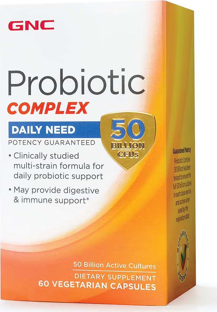 GNC Probiotic Complex Daily Need 1 Billion CFUs delivers 8 unique probiotic strains, including probiotics that have been clinically studied. Probiotics are beneficial bacteria that provide both digestive and immune support.* GNC’s probiotic products offer guaranteed potency, which means it has been tested to ensure the full 1 billion cultures in each dose are live and active when used by the expiration date – without the need for refrigeration! As a dietary supplement, take one capsule daily with food.