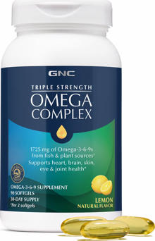 Help support your heart, brain, skin, eye and joint health with GNC Triple Strength Omega Complex softgels.* Sourced from fish and plants, this daily dietary supplement offers 1725mg of Omega-3-6-9s from wild, deep ocean fish, such as salmon, tuna, cod and anchovy. Plus, this supplement is purified to reduce contaminants like heavy metals, dioxins and PCBs. This fish oil supplement has a natural lemon flavor. As a dietary supplement, take three softgel capsules daily with food.
