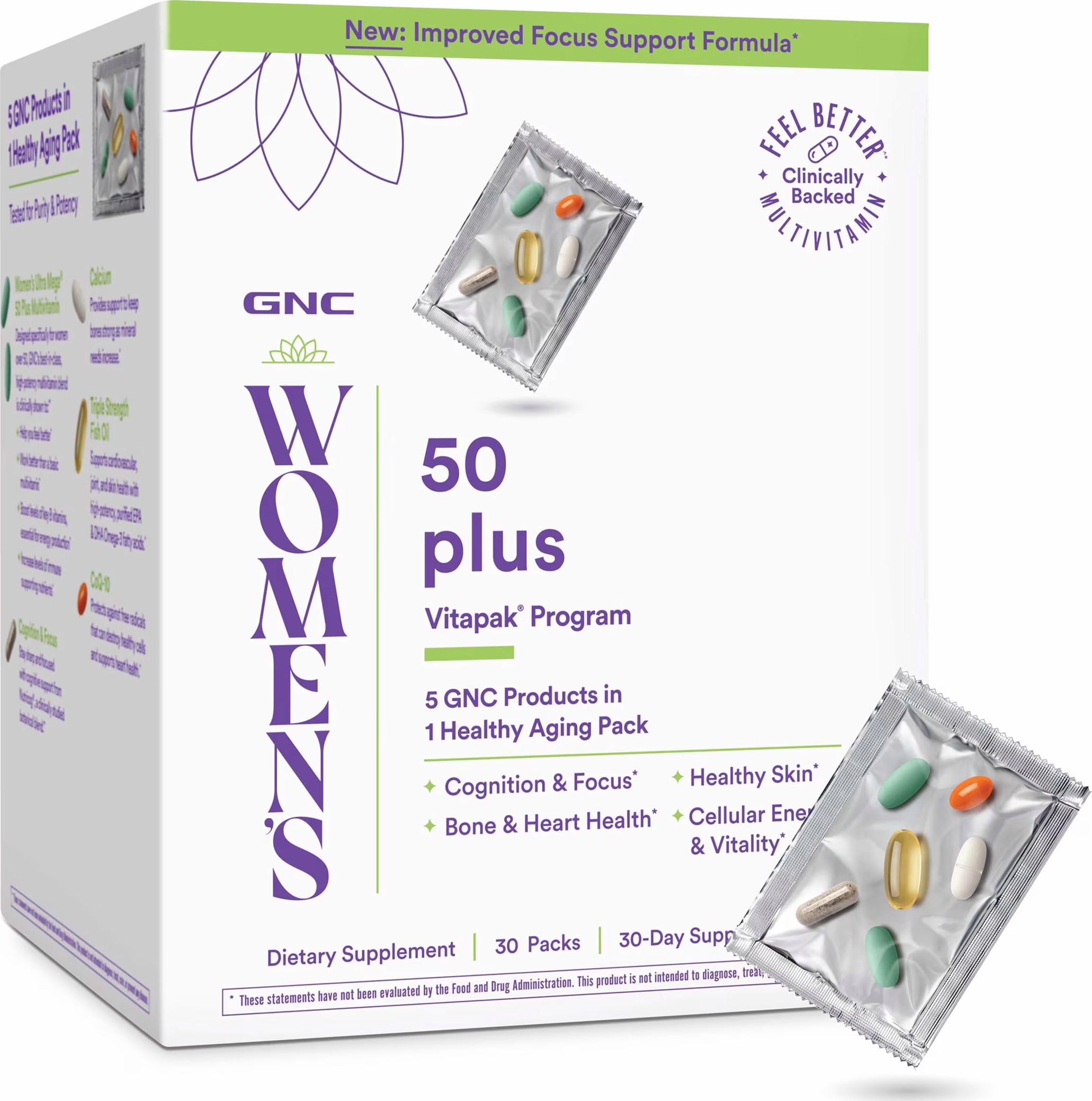 GNC's Women's 50 Plus Vitapak Program combines five unique components to help support bone, brain, heart health, and more. The program consists of a multivitamin, antioxidants, brain and bone-building complex, plus essential fatty acids to provide women the maximum daily support needed for healthy aging. This multivitamin includes everyday nutrients to sustain energy levels, memory, and mood function. Specially formulated with choline, B6, B12, folate, and Ginkgo Biloba to help support memory function and mental sharpness. Enhanced formula with added Vitamin D + Calcium, which may help protect bones against demineralization. Our formula also includes CoQ10, which may assist in replenishing energy levels and improving heart + cardiovascular health. GNC's Women's 50 Plus Vitapak Program is a comprehensive nutrient support system developed for women as they age. Get all of the essential vitamins and minerals your body needs in one convenient package - with no artificial colors, flavors, or preservatives. For over 85 years, GNC has been the leading global health and wellness brand providing the best in performance inspired nutrition. We are committed to meeting the highest standards while applying the most up-to-date advances in nutritional science. Above all else, GNC aims to inspire people to live well.