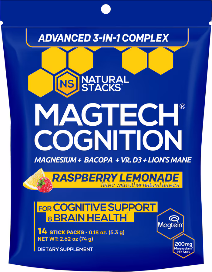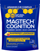 Natural Stacks MagTech Cognition with Bacopa Vit D3 Lion's Mane Rasoberry Lemonade Description Magtech Cognition Magnesium + Bacopa + Vit. D3 + Lion's Mane Advanced 3-In-1 Complex For Cognitive...