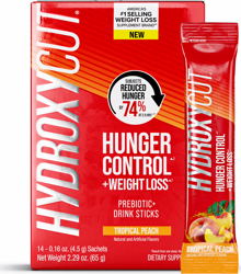 Hydroxycut Hunger Control1 +Weight Loss2 Drink Mix gives you a powerful, non-stimulant way to take control of your weight loss journey. This delicious tropical peach-flavored drink mix features a unique blend of patented SlimBiome, a prebiotic plus fiber complex scientifically shown to help participants reduce hunger by 74% at 2.5 hours1, and green coffee bean extract, a scientifically researched weight loss ingredient. With no need for a prescription, this formula helps to control hunger for real results. Each convenient sachet mixes with water, making it easy to enjoy at home or on the go.