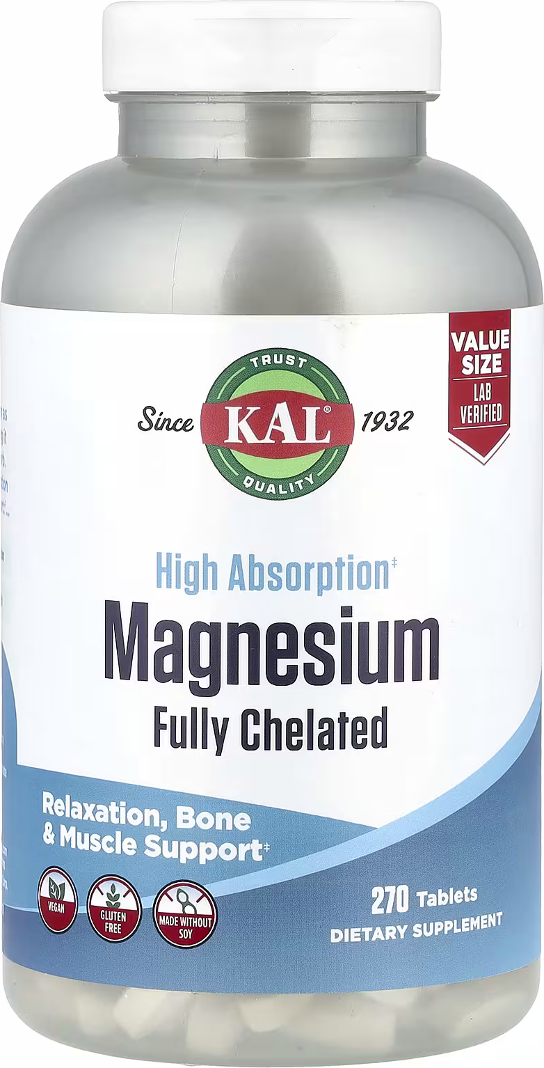 Our magnesium glycinate (also known as bisglycinate) is fully chelated, making it easy for the body to digest and absorb. Gentle on the stomach, KAL High Absorption Magnesium Glycinate may help support: