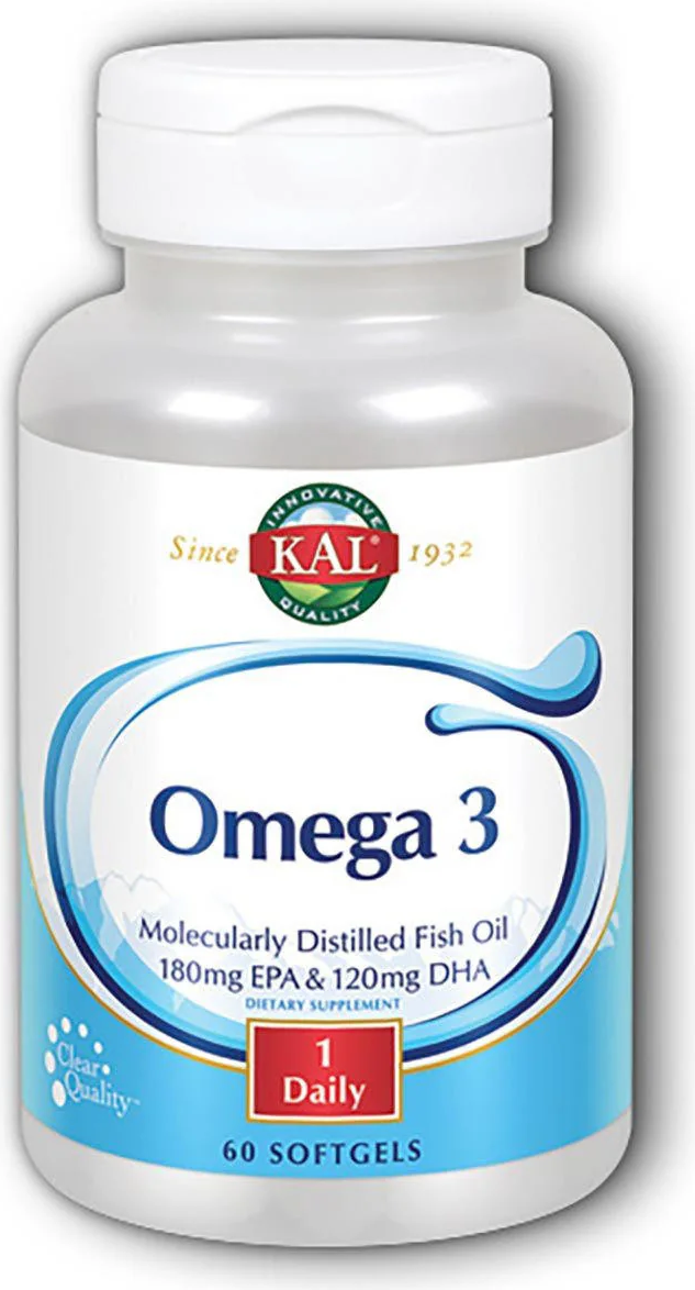 KAL Omega 3 Fish Oil comes from cold water fish. KAL fish oils go through a purity process, including molecular distillation, to remove heavy metals, PCBs, dioxins, furans and other contaminants to meet superior fish oil standards. Each softgel contains 180 mg EPA & 120 mg DHA with natural Vitamin E to preserve freshness.