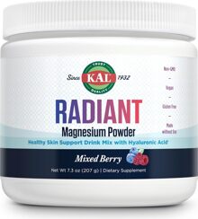 Our gentle Magnesium powder drink mix features beneficial Magnesium Citrate, Vitamin C and Zinc for gull body nourishment. It also provides Hyaluronic Acid to help support skin elasticity and radiance. Made with a clean formula and featuring natural mixed berry flavor, KAL Radiant Magnesium helps support your skin from the inside, out for healthy, vibrant-looking skin.