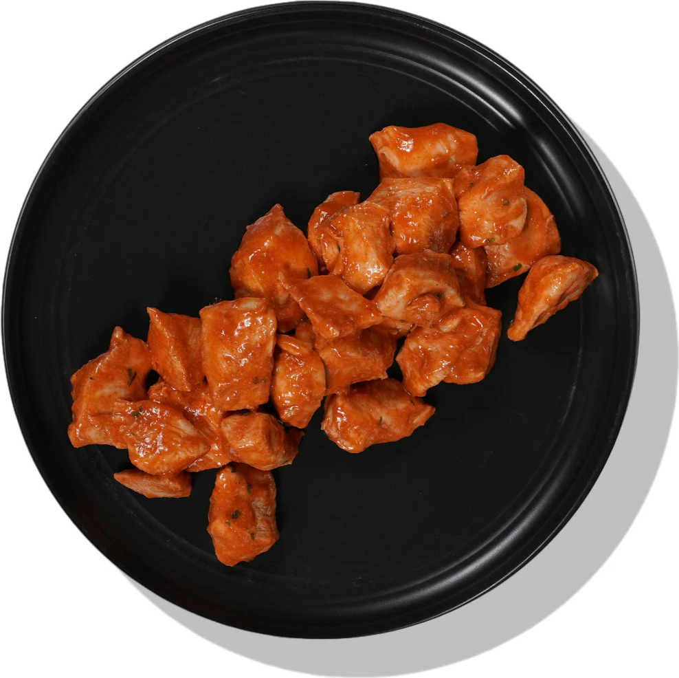 Seasoned chicken breast bites are oven roasted and tossed in spicy buffalo sauce. Macros are per 4 oz serving, about 4 servings per container.