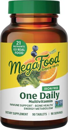 Looking to boost an already well-balanced lifestyle? MegaFood One Daily Iron Free is our signature, once-daily multi, designed for anyone who wants to support their optimal health and well-being with an iron-free formula. We include a nourishing blend of vitamins and minerals delivered with real, whole foods, including orange, carrot, rice, and nutritional yeast. B vitamins support healthy energy production and nervous system health, and 400 IU (10 mcg) of vitamin D supports healthy bones. Beta carotene, along with vitamins C, E and D, help support normal immune function.