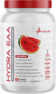 Metabolic Nutrition Hydra EAA is a fully comprehensive amino formula which features BCAAs and EAAs as well as a Carbohydrate, Sugar and Insulin Stabilizing Formula and a Hydration Modulator Formula. Hydra EAA can be sipped through out the day as an alternative to drinking water, taken as a pre-workout, intra-workout, or a post workout recovery drink.