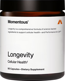 Longevity from Momentous is expertly formulated to support cellular energy, balance, and long-term resilience. It features clinically backed Niagen to promote increased NAD+ levels, as well as essential B vitamins to support metabolic health, NAC and vitamin C to defend against oxidative stress, betaine to aid cellular function, and PQQ to fortify mitochondrial health.