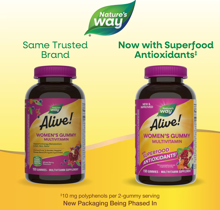 - Nature’s Way Alive! gummy vitamins for women support heart health, immune health, muscle function, metabolism, and hair, skin, and nails.* With superfood antioxidants.‡ (‡10 mg polyphenols per 2-gummy serving)
