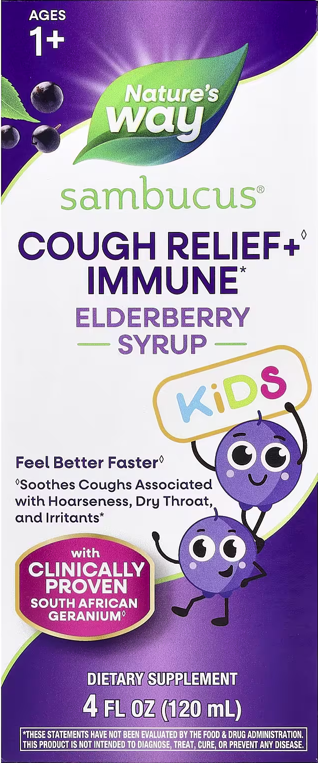 Feel better faster with the delicious Nature's Way Sambucus Cough Relief+^ Immune Syrup*.^With South African Geranium root extract to soothe occasional coughs associated with hoarseness, dry throat, and irritants and reduce the duration and severity of minor nasal, throat, and chest irritations.* Sambucus Cough Relief^+ Immune Syrup* combines clinically proven South African Geranium root extract with black elderberry extract into one formula that unites traditional wisdom with modern science. Our proprietary South African Geranium root extract (EPs 7630) is the only clinically proven South African Geranium root extract backed by 30 years of research shown to be safe and effective. This formula also includes vitamin C, and zinc to support healthy immune function.*
