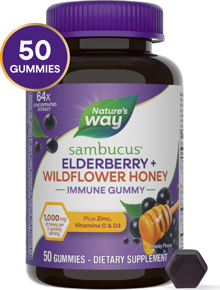 - Nature’s Way Sambucus Elderberry + Wildflower Honey Immune Gummies for adults and kids ages 4+ help support immune health with high potency vitamins C & D3, an excellent source of zinc, and a 64x highly concentrated black elderberry extract.