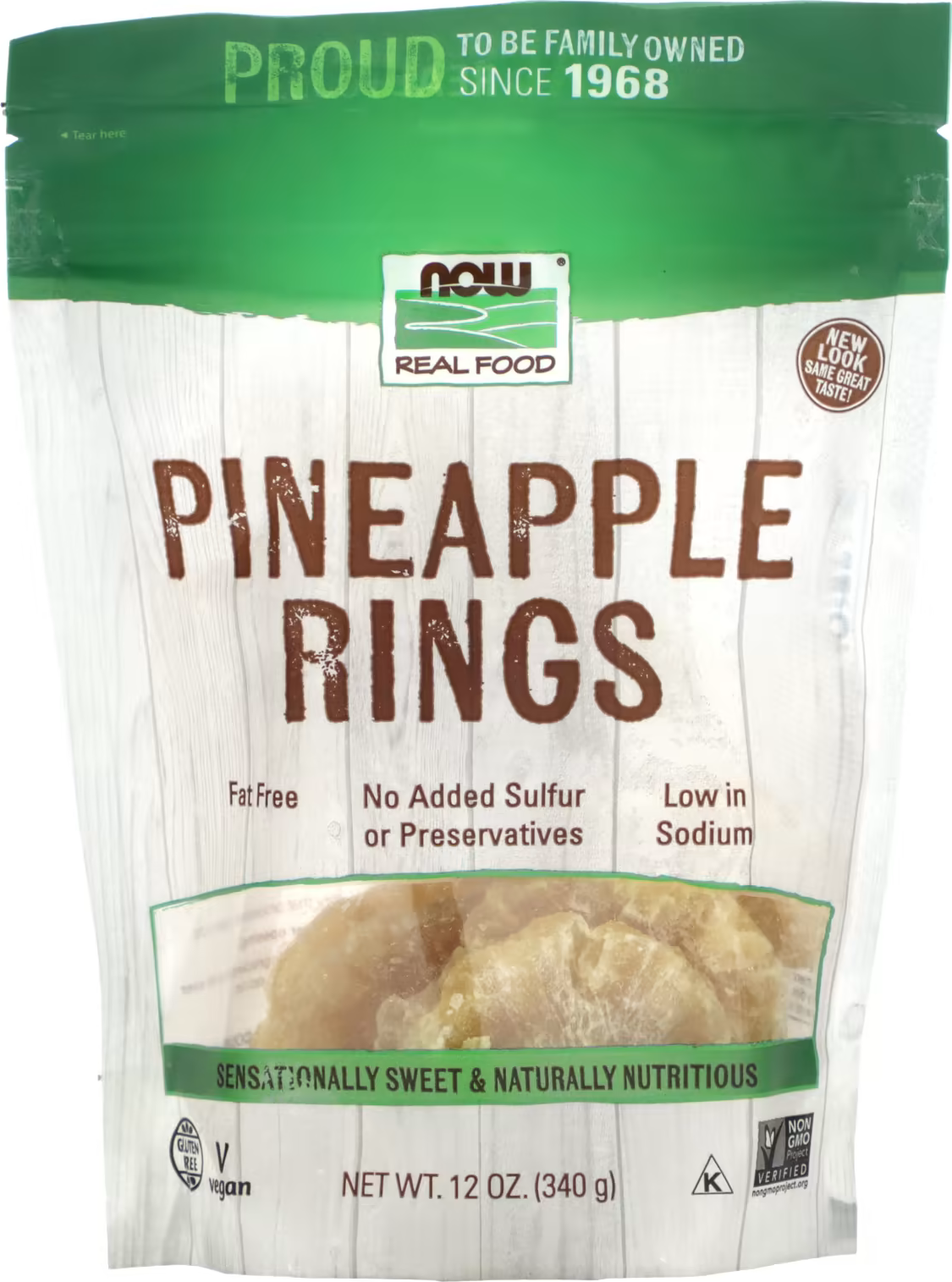 NOW Real Food Pineapple Rings are more than just a tasty ingredient or snack – they’re also a phenomenal fusion of natural nutrients. In addition, pineapples have a unique naturally occurring digestive enzyme called bromelain. With pineapples, you’ve got a fantastic fusion of nutrition and flavor that’s tough to beat.