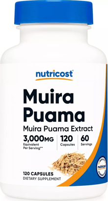 Go to StoreNutricost Muira Puama Extract Capsules deliver a concentrated 10:1 extract, providing 300mg per serving—the equivalent of 3,000mg of Muira Puama bark. Sourced with quality and purity in mind, this traditional Amazonian herb has been valued for generations and is now available in a convenient, modern capsule form. Each bottle contains 120 vegan-friendly capsules (60 servings) and is made without GMOs or gluten, supporting a clean wellness routine for both men and women. Whether you're exploring herbal supplements for the first time or adding to an existing regimen, Nutricost Muira Puama is a trusted choice for those seeking simplicity, strength, and integrity in every capsule. Manufactured in an NSF Certified, GMP Compliant, FDA Registered Facility for quality you can rely on.