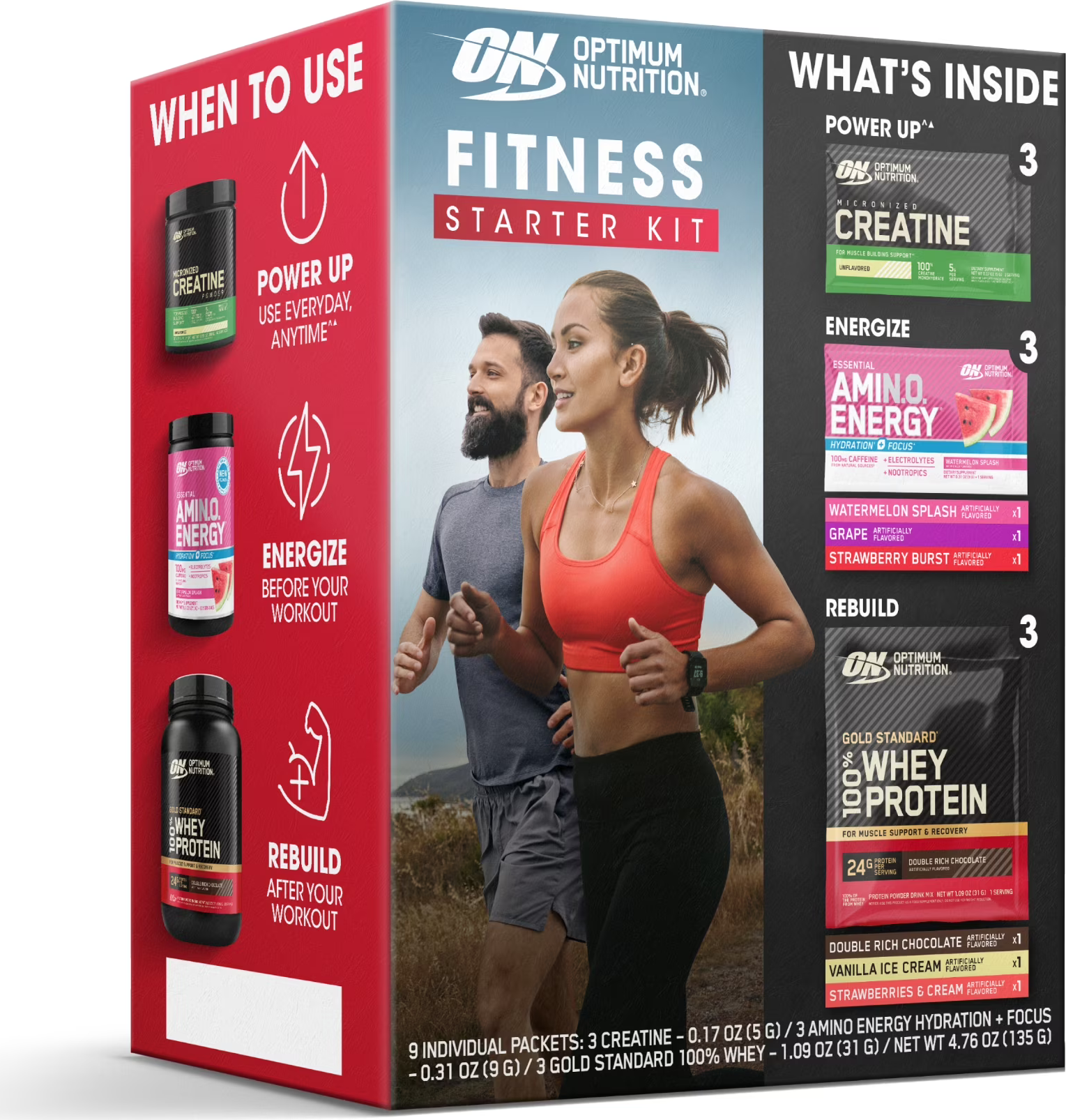 Unlock your new fitness routine with our all new Fitness Starter Kit from Optimum Nutrition. Within each starter box is 9 individual packets that will help you Power Up with Micronized Creatine, Energize with Amino Energy Hydration + Focus and Rebuild with Gold Standard 100% Whey Protein, delivering all the tools for a better workout. Put together, it’s precisely what you’ve come to expect from Optimum Nutrition – the World’s #1 Sports Nutrition Brand.