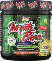 Psycho Pharma Infinite Brain is a Nootropic formula designed to provide powerful physical and mental energy. This formula features cognitive boosters and Nootropics like Alpha GPC, Mucuna Pruriens, Lions Mane and more to help support brain health, reaction times and cognitive energy. Infinite Brain is a great coffee alternative, an excellent after lunch pick me up and can even be used as a preworkout.