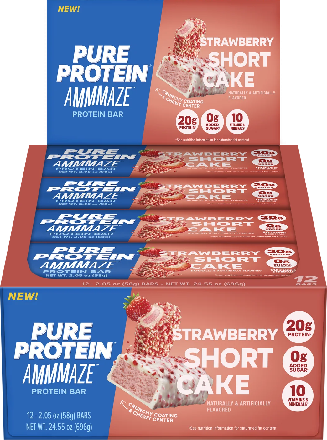 Go to StorePure Protein AMMMAZE Strawberry Shortcake bars features a strawberry ice cream-flavored center dipped in a creamy vanilla coating and is topped with crave-worthy pink crunchies. 20g of protein. 0g of added sugar. 10 vitamins & minerals. 220 calories.