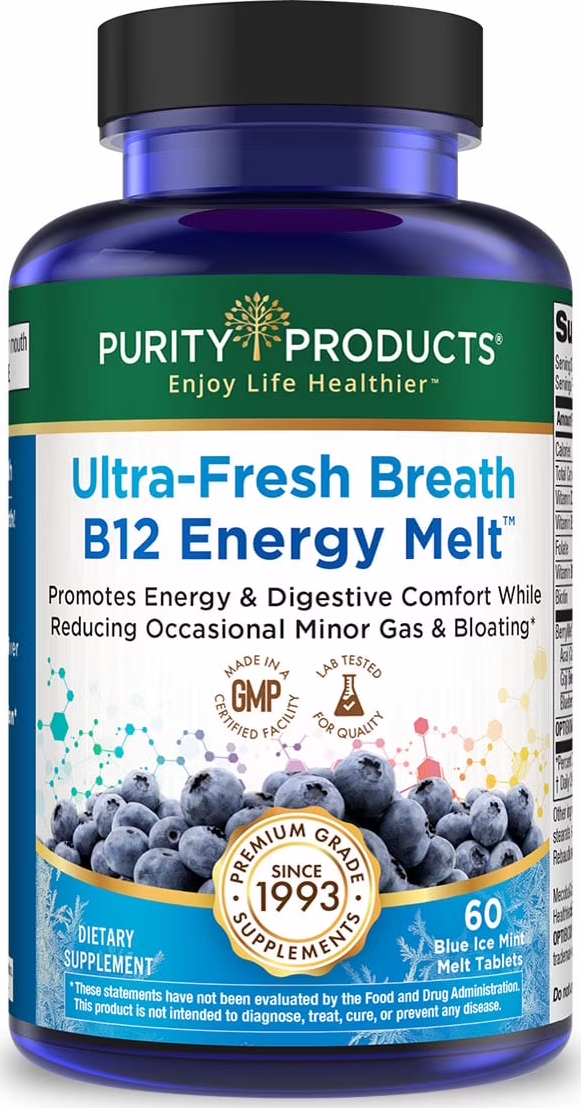 Quick-dissolving Blue Ice Mint tablets delivering 1000 mcg of bioactive methylcobalamin B12, enhanced with OPTI BIOME probiotic, zinc, vitamin D3, and biotin. Formulated for fresh breath, energy...