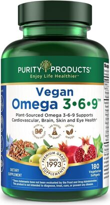 - 100% PLANT BASED VEGAN OMEGA 3 6 9 FATTY ACIDS SUPPLEMENT – Finding essential fatty acids can be a challenge on a vegan diet. But with Purity’s Vegan Omega 3-6-9, you’ll get a full serving of the “good fats” your body needs – 500 mg of Omega 3, 180 mg of Omega 6, and 680 mg of Omega 9 from non-GMO plant and seed sources.