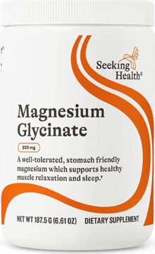 Magnesium Glycinate by Seeking Health contains magnesium in the glycinate form. Compared to magnesium citrate and magnesium oxide, magnesium glycinate supplementation is less likely to stimulate GI upset or loose bowels. Chelating to the amino acid glycine reduces the irritation that magnesium can exert in the GI tract.