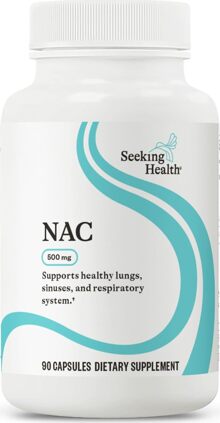 NAC by Seeking Health provides 500 mg of N-acetyl-L-cysteine per vegan capsule.