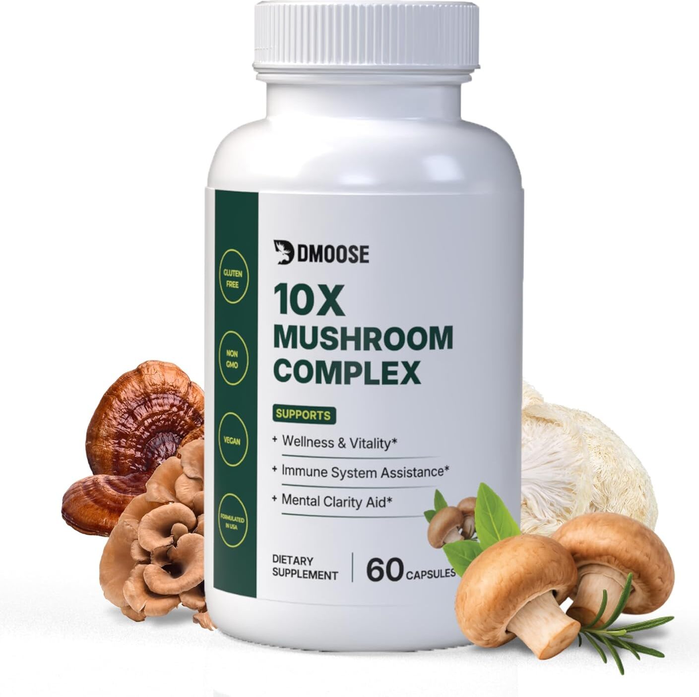 About this item 5 MUSHROOMS IN 1 POWERFUL CAPSULE: Simplify your health routine with DMoose Mushroom Supplements, a potent 5-in-1 formula combining Lions Mane, Chaga, Maitake, Shiitake, & Reishi...