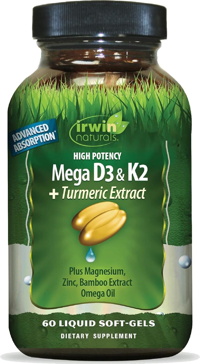 Description Irwin Naturals Mega D3 and K2 + Turmeric 60ct Irwin Naturals Mega D3 and K2 Supplement is a high potency supplement containing Vitamin D3, K2 and Turmeric to help support bone health,...