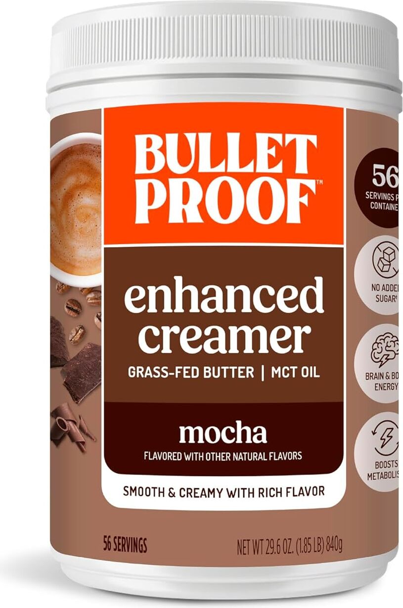 About this item Better-For-You Creamer: Value size 29.6 ounce container of Bulletproof Mocha Enhanced Creamer, a shelf-stable coffee creamer powder Smooth & Sippable: Rich, creamy flavor made with...