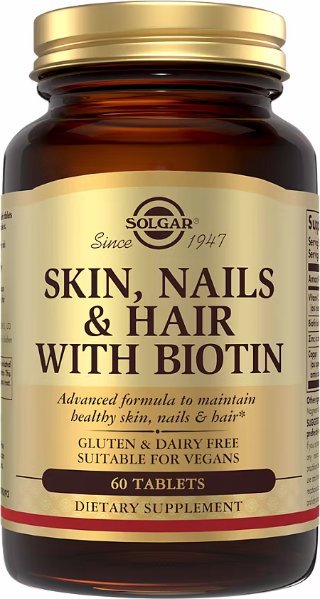 Solgar Skin, Nails & Hair + Biotin tablets nourish your body from the inside out. OptiMSM supports healthy nails and shiny hair. Vitamin C promotes healthy collagen production.Biotin is a beauty powerhouse that supports healthy skin, hair and nails.