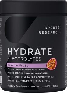 The Sports Research Hydrate Electrolytes Jar offers our signature delicious hydrate electrolytes—now even bigger and better! Our formula is sugar-free and flavorful, offering 400 mg of Sodium and 200 mg of Potassium—along with over 65 trace minerals, seven essential vitamins, and Coconut Fruit Water Powder —per serving to support daily hydration. Embrace the Sport of Life with electrolytes and a flavor that matches your vibe.