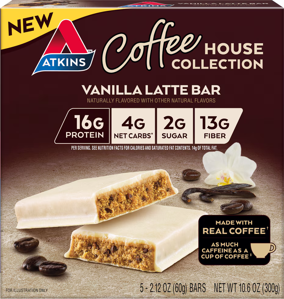 Coffee House Collection Meal Bar Description from Atkins Atkins Coffee House Collection Vanilla Latte Bars blend the smoothness of real coffee with the sweetness of vanilla flavor, offering a...