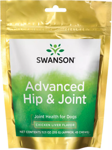 Advanced Hip & Joint for Dogs from Swanson Pet Nutrition combines joint tissue nutrients like glucosamine, chondroitin, MSM, green-lipped mussel and hyaluronic acid with omega-3 fatty acids, antioxidants, enzymes and time-tested joint health herbs like boswellia and turmeric—all in chicken liver-flavored soft chews.