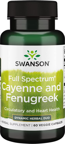 Full Spectrum Cayenne & Fenugreek from Swanson combines two of the world's most effective herbs for circulatory support. Cayenne is best known for its spicy flavor, but that capsaicin also provides powerful support for circulatory health, promoting blood flow to all the major organs. Fenugreek features steroidal saponins that support healthy fat and carbohydrate metabolism and promote a healthy lipid balance in the bloodstream. Together they constitute an effective way to care for your cardiovascular system daily.