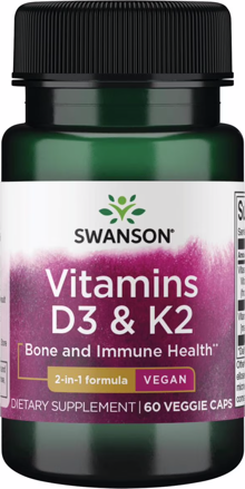 Better together! Emerging research suggests that vitamins D3 and K2—two key nutrients for efficient calcium usage in the body—may have an even more beneficial effect when taken together. Swanson Vitamins D3 & K2 offers these heart and skeletal health helpers in a convenient, one-a-day veggie capsule.