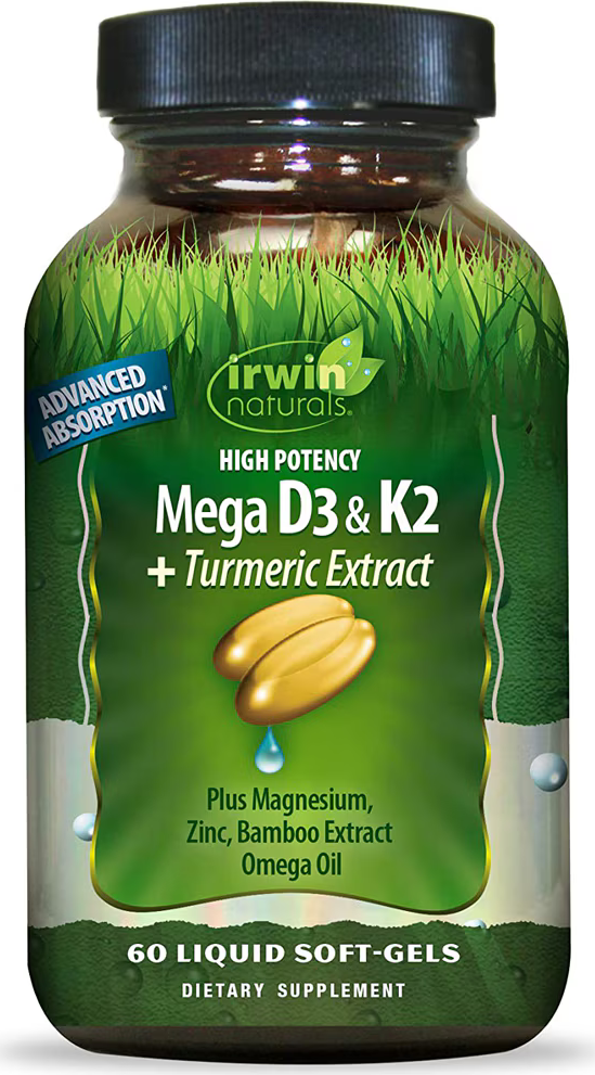 Description Irwin Naturals Mega D3 and K2 + Turmeric 60ct Irwin Naturals Mega D3 and K2 Supplement is a high potency supplement containing Vitamin D3, K2 and Turmeric to help support bone health,...