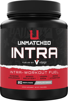 - Vitargo — clinically proven high-molecular-weight carbohydrate that empties faster and delivers 77% greater glycogen recovery than traditional carbs. Unmatched is the first third-party brand in North America to use it.†
